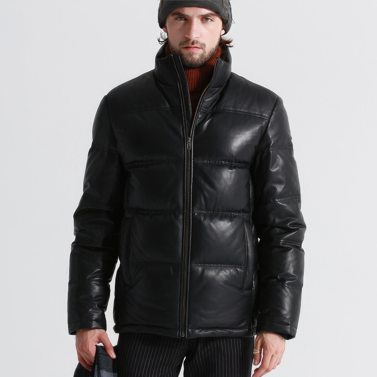 Men’s Black Genuine Sheepskin Polo Neck Thick Winter Quilted Warm Fashionable Padded Puffer Leather Jacket