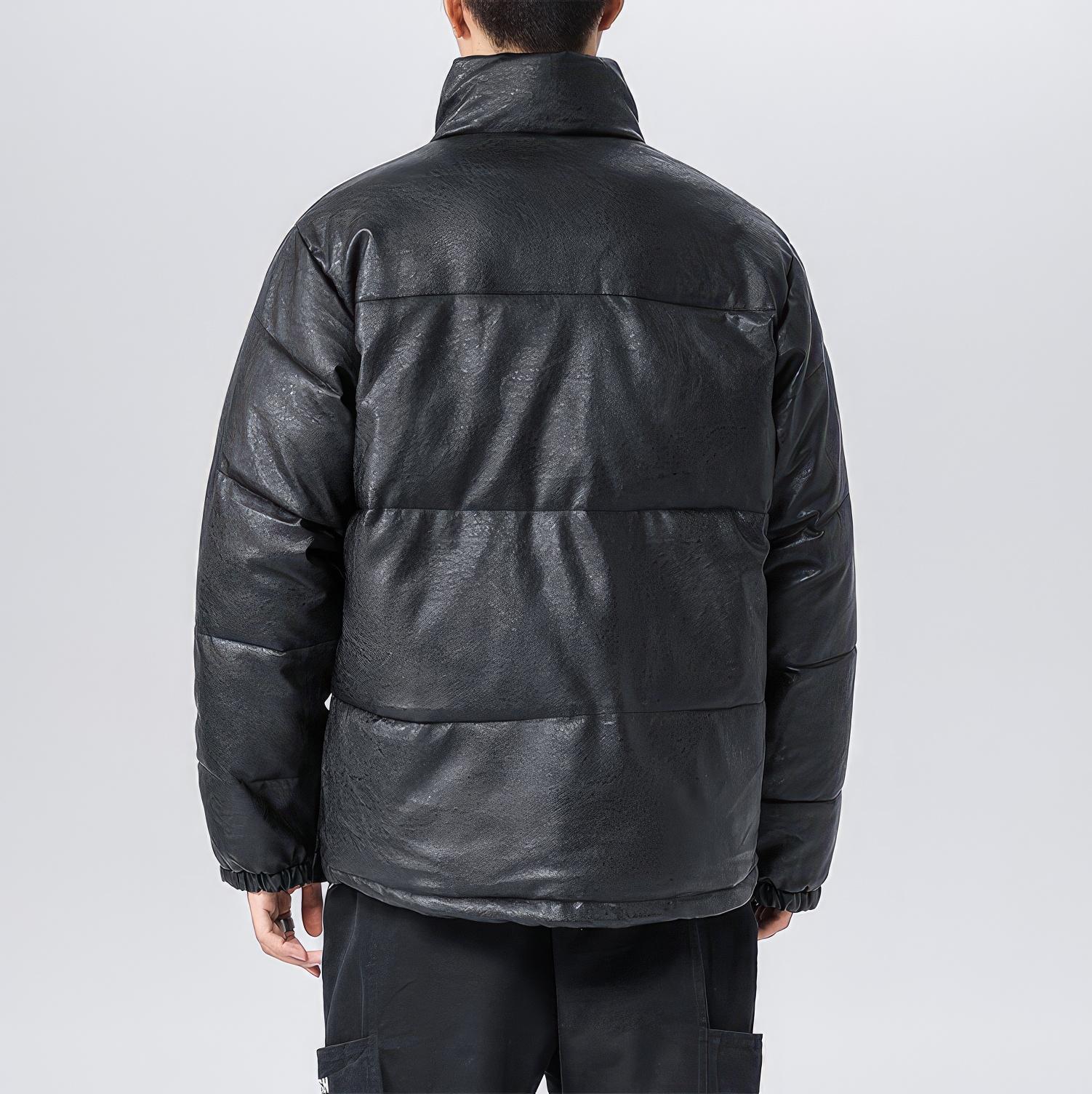 Men’s Black Genuine Sheepskin Stand Collar Winter Warm Casual Baggy Style Padded Puffer Leather Jacket
