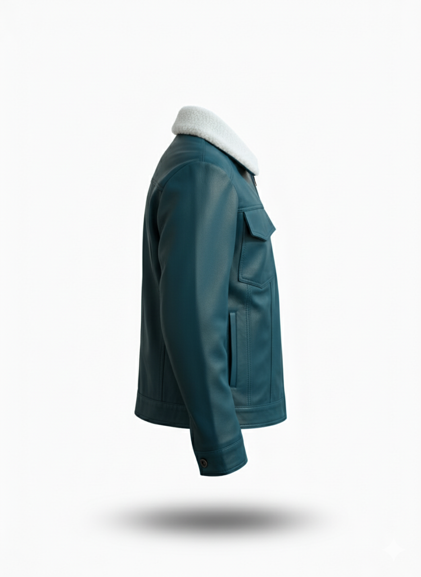 Men’s Blue Leather Jacket with Faux Fur Collar