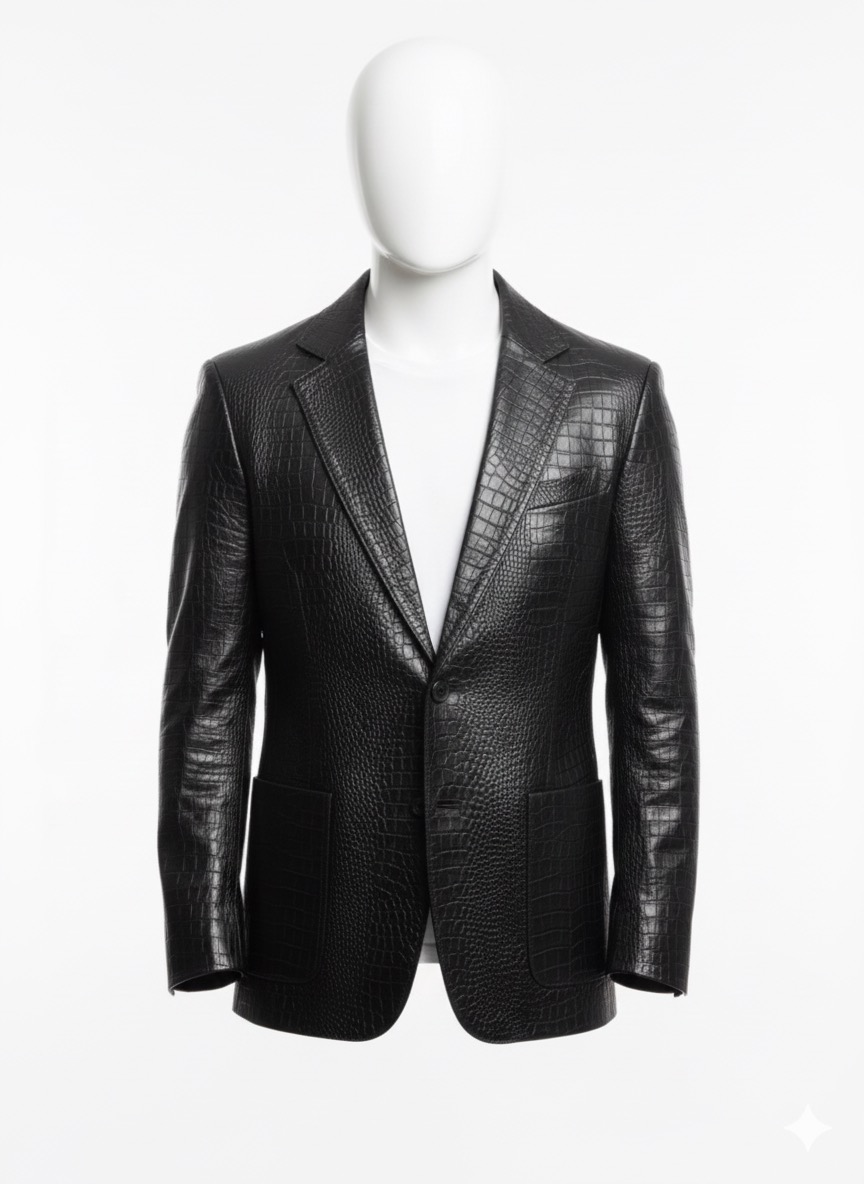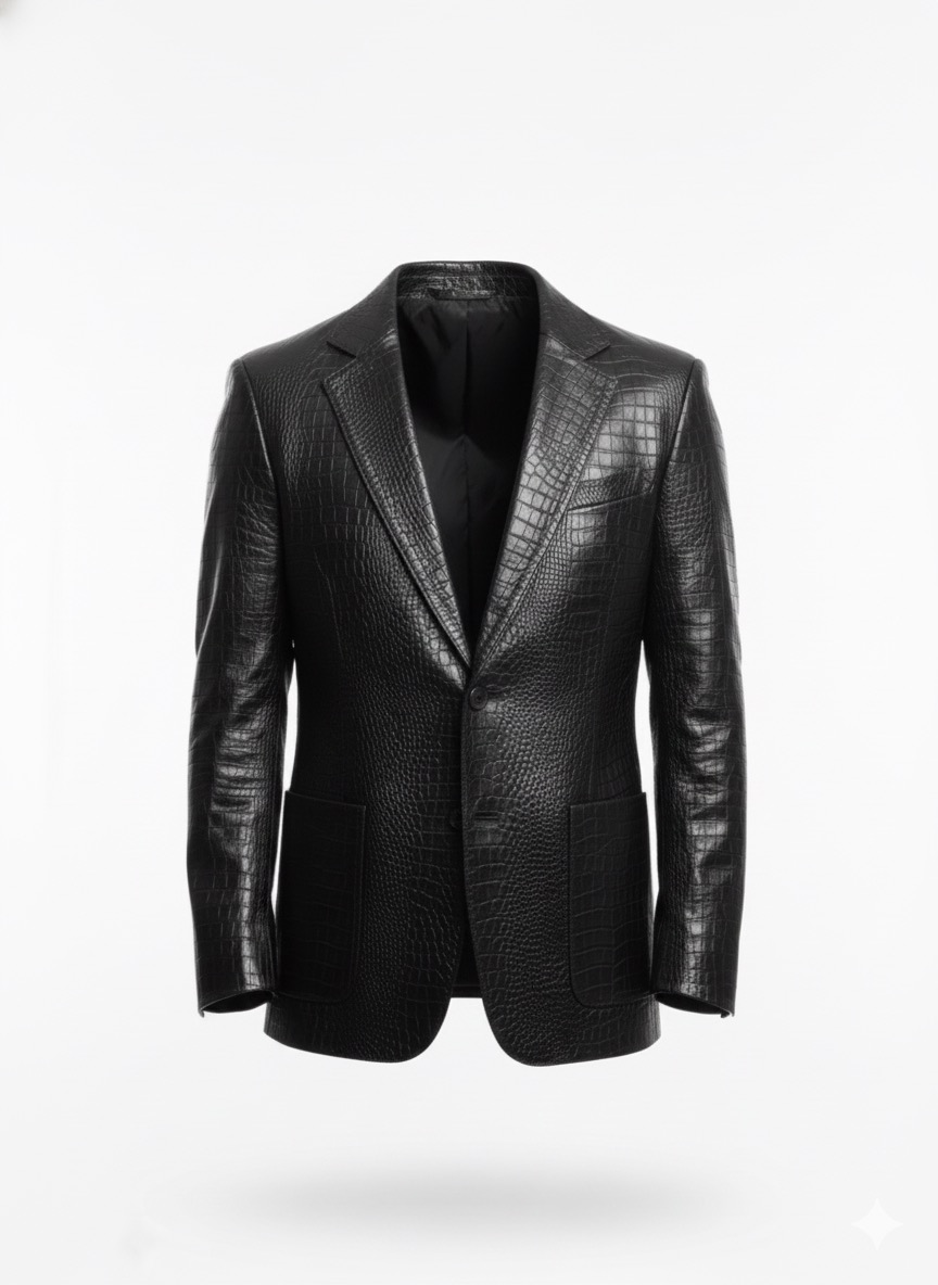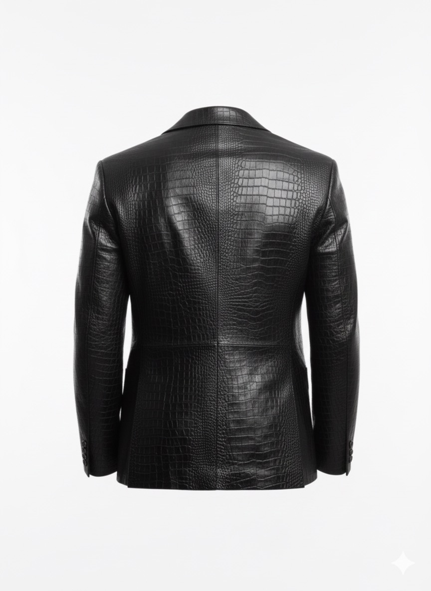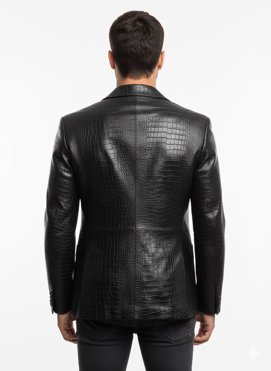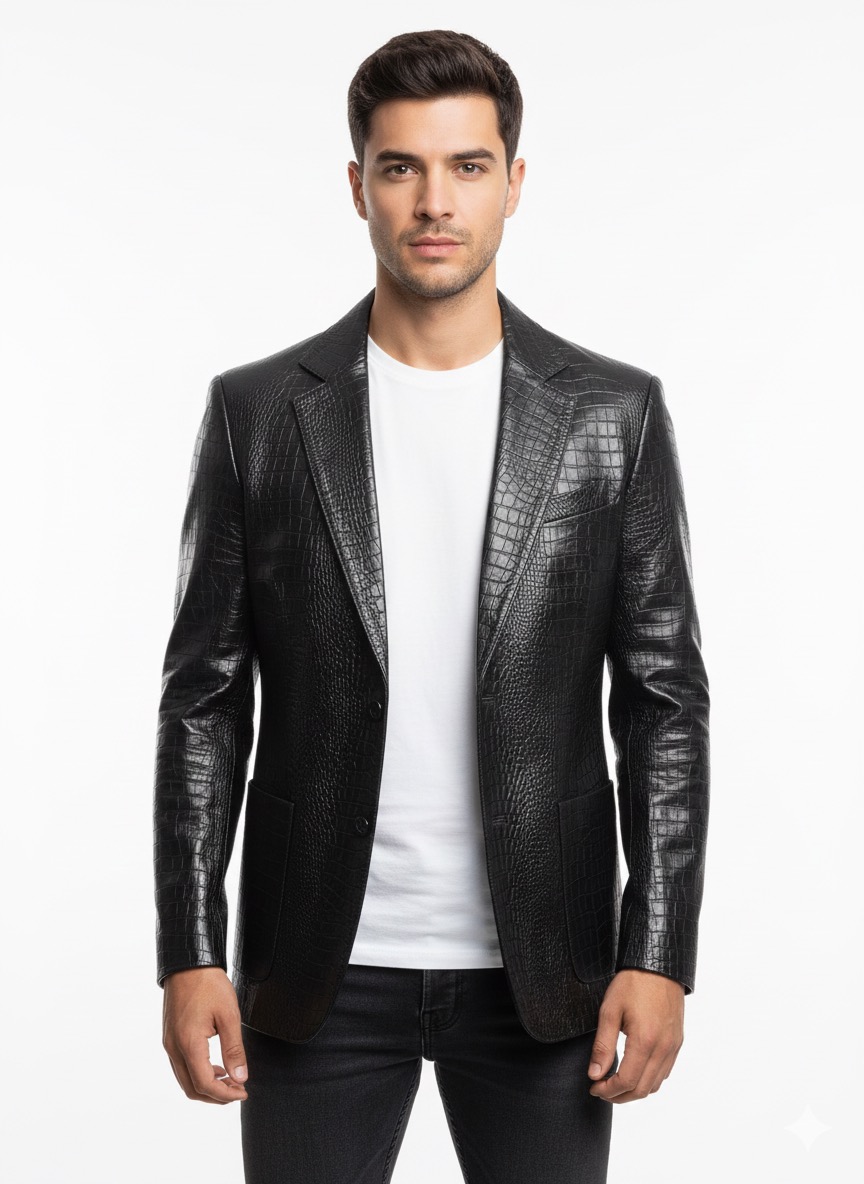 Men’s Crocodile Skin Pattern Genuine Lambskin Leather Casual Dress Suit Black Blazer Coat